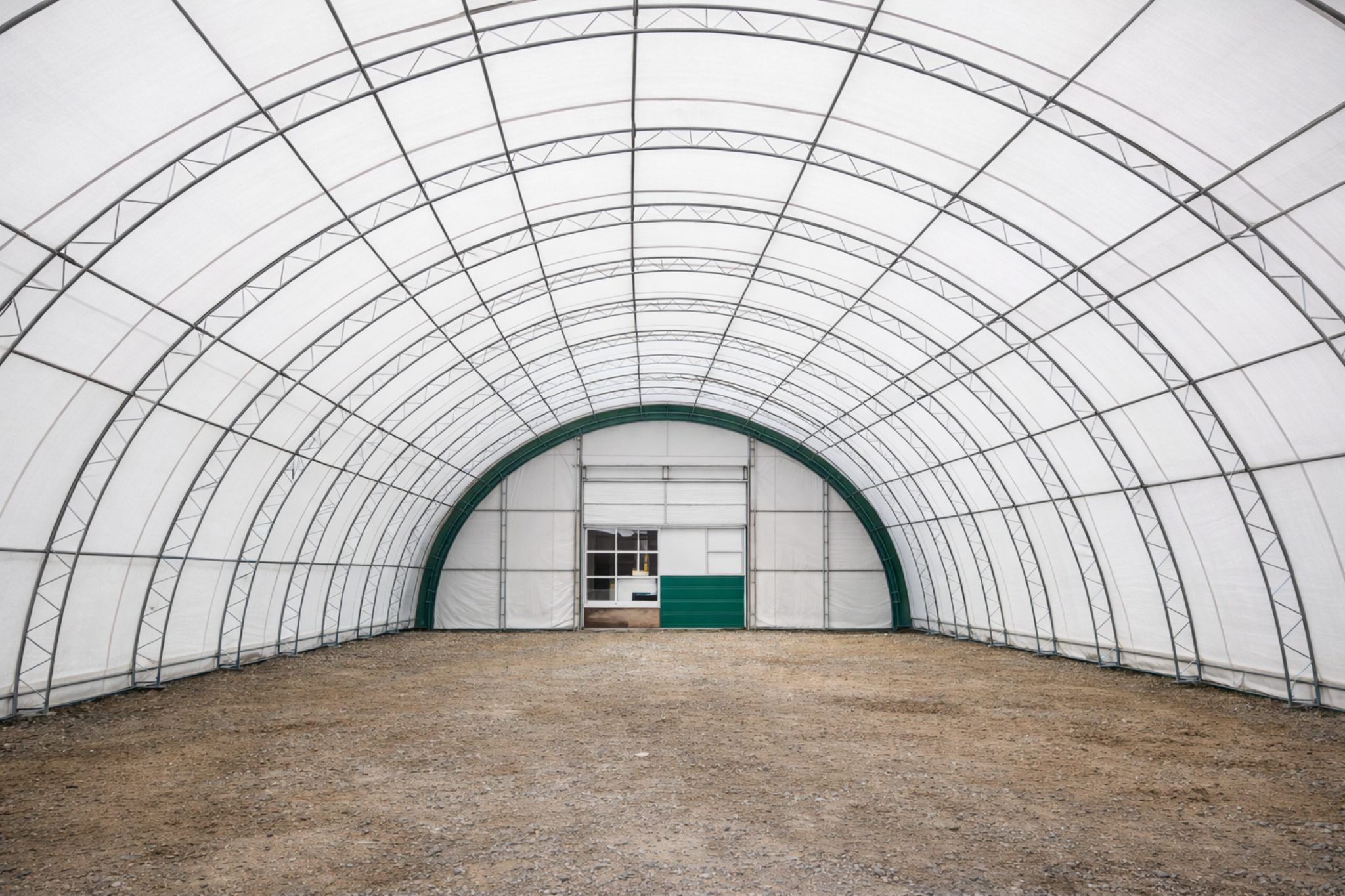 Struttura a tubolare doppio in acciaio zincato Profilo archi 60x1,5mm, Profili arcarecci 60x1,5mm, Distanza tra gli archi 3,05m, Porta Arrotolabile da 4,27xh4,5m. Telo da 750g/mq.