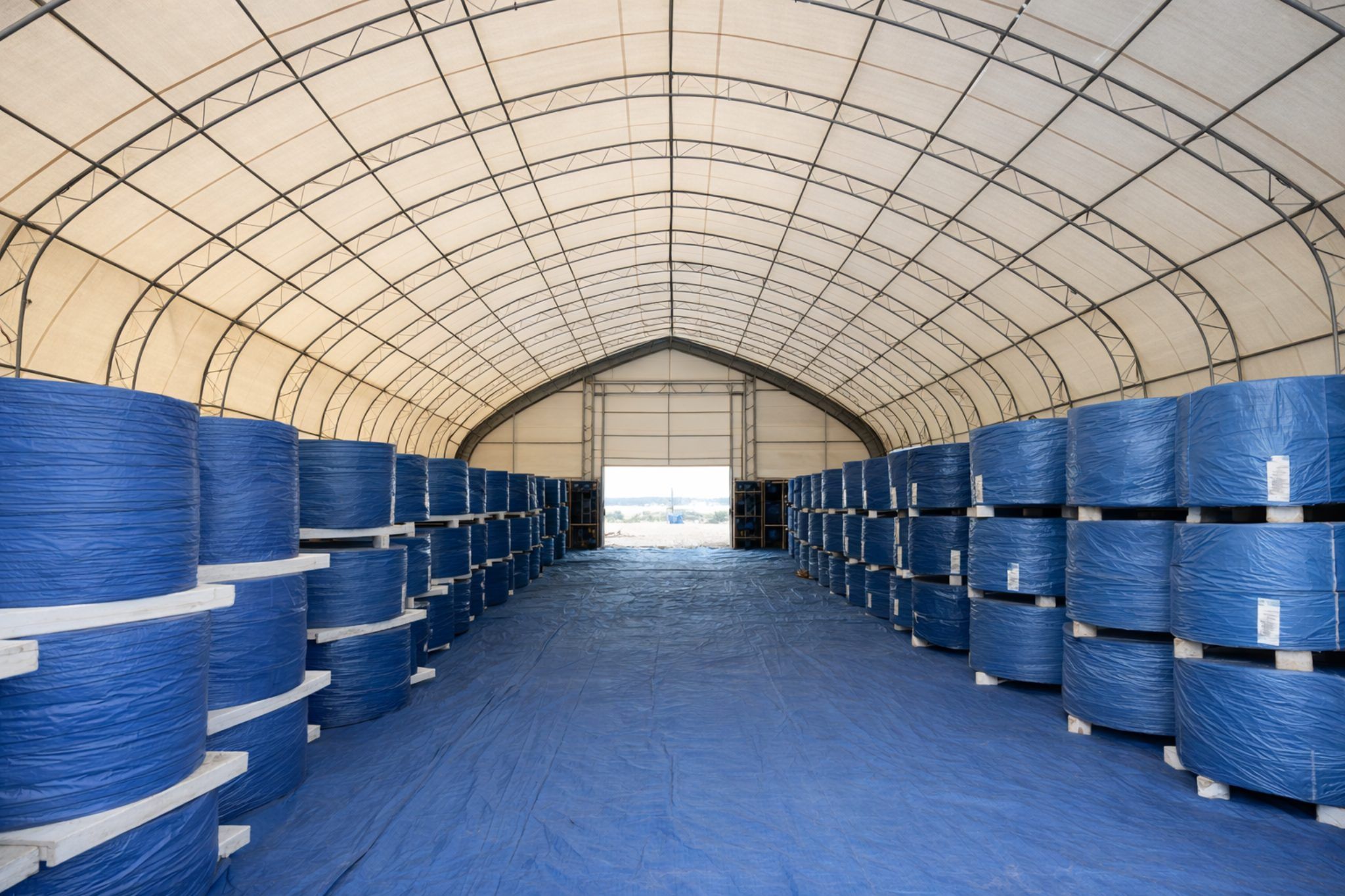 Struttura a tubolare doppio in acciaio zincato Profilo archi 60x1,5mm, Profili arcarecci 60x1,5mm, Distanza tra gli archi 3,05m, Porta Arrotolabile da 4xh4m. Telo da 750g/mq.