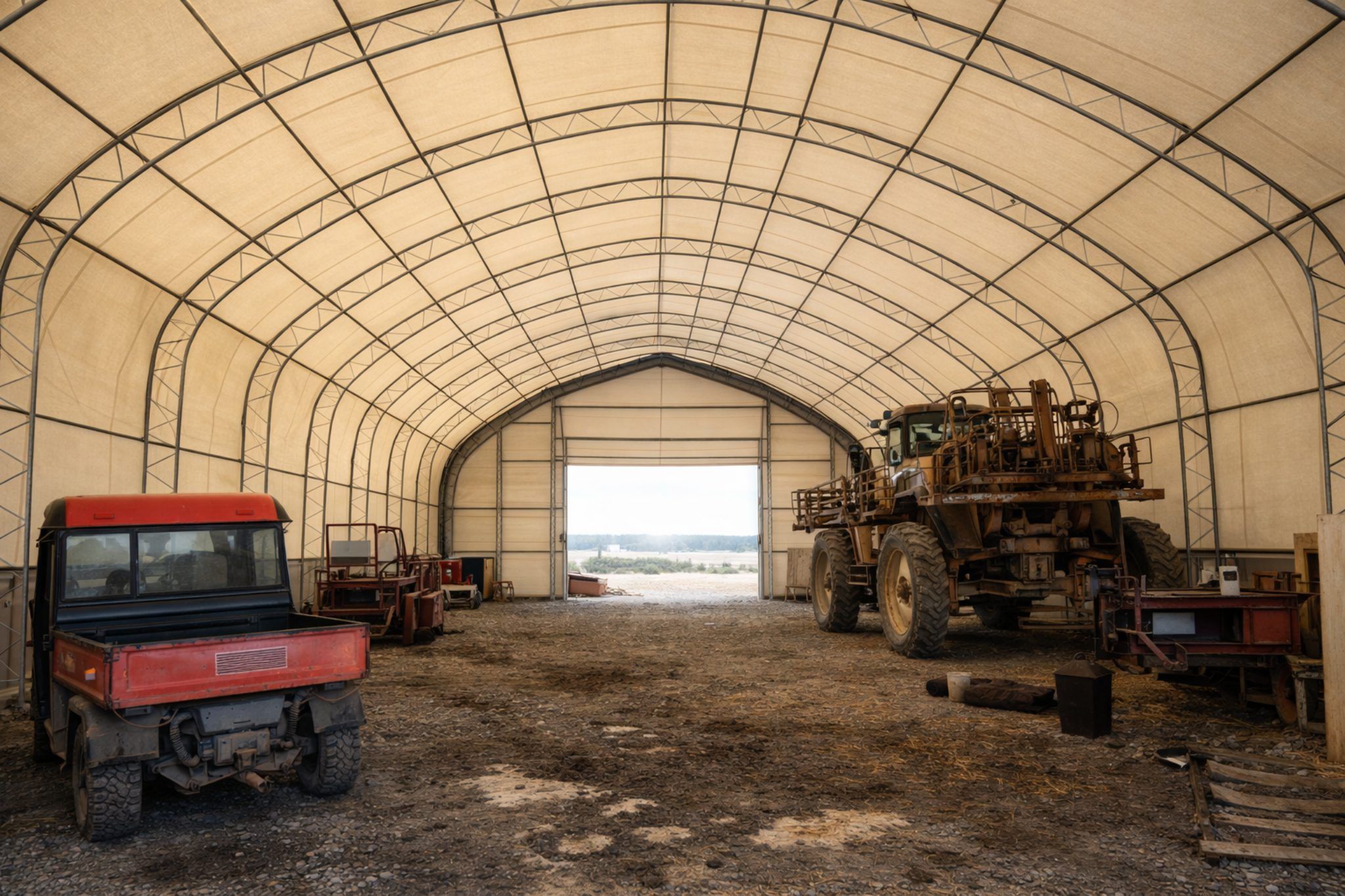 Altezza 4,5m Struttura a traliccio in acciaio zincato doppio Profilo archi 60x1,5mm Profili arcarecci 48x1,5mm Distanza tra gli archi 3m Senza copertura alle estremità. Telo da 750g/mq.