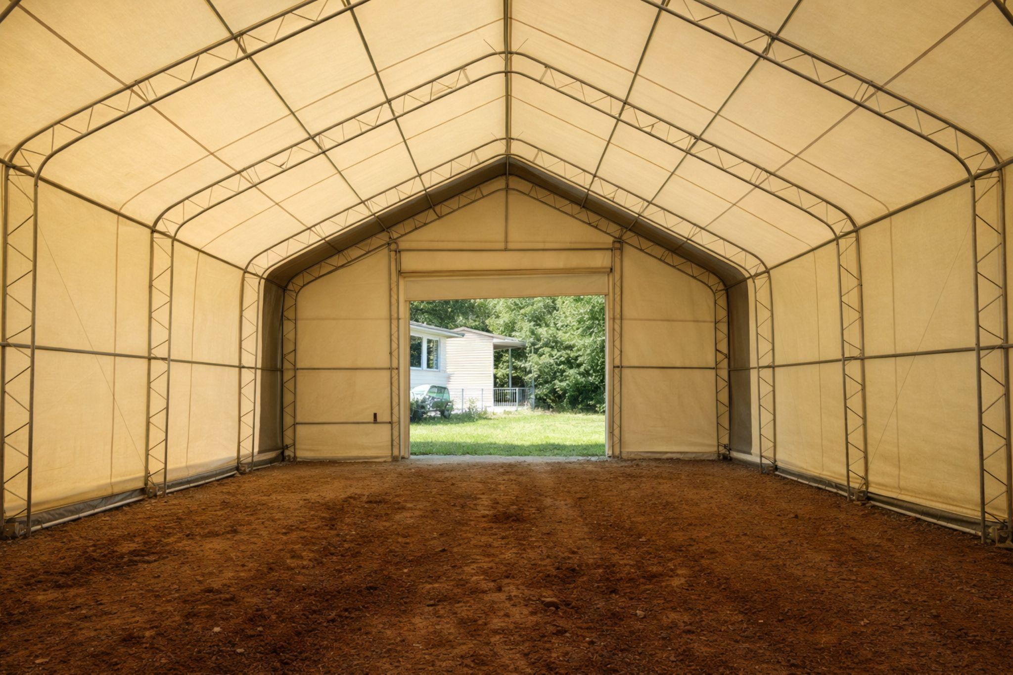 Struttura a tubolari doppi in acciaio zincato Profilo archi 76x2mm, Profili arcarecci 60x1,5mm, Distanza tra gli archi 3,05m, Porta Arrotolabile da 5,49xh4,89m. Telo da 750g/mq.